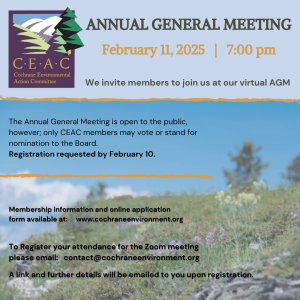 The Cochrane Environmental Action Committee Annual General Meeting is scheduled for Tuesday, February 11, 2025. This will be a virtual meeting hosted on Zoom. The meeting is open to the public, however; only CEAC members may vote or stand for nomination to the Board. A link will be sent to you upon registration prior to February 10th.
